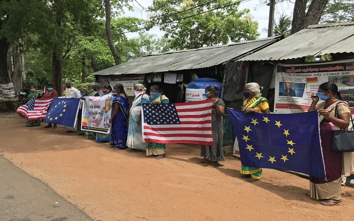 Homage were paid to Sinnasamy Nallathamby who died while participating in several struggles for his son and others who had gone missing. The demonstrators carried the portraits of Sinnasamy Nallathamby and national flags of foreign countries including that of USA. Memorial flames were lighted for Nallathamby and floral tributes were paid.